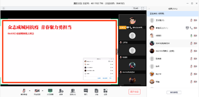 关于调整2019-2020学年第二学期本科教学工作安排的通知》的精神要求, 064182团支部积极响应学校“停课不停学”的号召,组织各位同学在家中举行线上团会。在活动开始前,每一位支部成员均提前上线签到,体现了同学们对本次团会的重视程度。14时,全体在线上奏唱国歌,主持人李伟光宣布“众志成城同抗疫,青春聚力勇担当”主题线上团会正式开始。