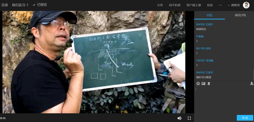 参加秭归地质实习学生为2018级163名本科生,因疫情影响7名学生未能抵达实习基地进行实习。实习队坚持疫情期间教学“学生一个都不能少”的指导思想,陈丽霞队长与在站教师第一时间讨论确定野外线上直播教学方案,针对未能返校同学组建线上实习小组,由实习队袁晏明教授单独带班。参与直播学生虽然不能触碰到露头岩石、使用罗盘、敲取标本,但野外“云”实践教学有很好的野外实践带入感,最大程度减少了疫情对学生实习质量的影响。该 “云”直播的教学方式启发和拓宽了学院地质实习在特殊时期的应急教学思路,为后期线上教学和线下实习充分融合提供了良好实践。