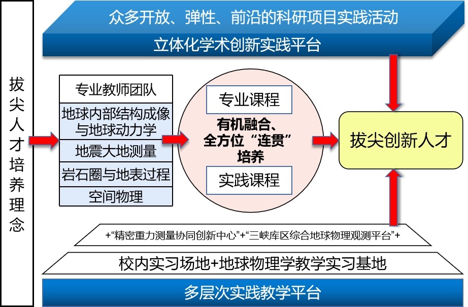 学院抓住地球物理学拔尖人才培养难点和薄弱环节,以实践教学基地建设、专业课程改革、实践平台内涵创新为突破口,将实践教学融入专业人才培养全过程建设多层次、全方位、立体化的实践教学平台,支撑国家一流学科拔尖人才培养:一是重点改革地球物理学北戴河教学实习,打造新的软硬件兼备的多层次实践教学平台;二是优化调整专业课程体系,突出和强化实践教学环节,形成课堂教学和实践教学的有效融合,全方位“连贯”培养学生实践创新能力;三是立足教学团队学科专业优势,通过构建开放弹性的实践训练模式,构建立体化学术创新实践平台,扶助学生尽快适应和融入专业学习,实现在科教融合中培养高质量创新人才的目标(见图2)。