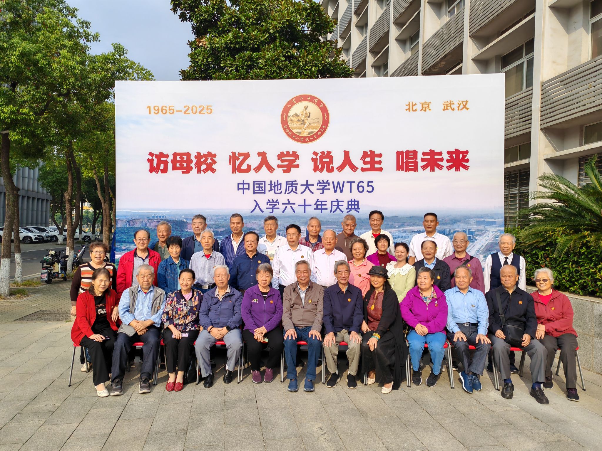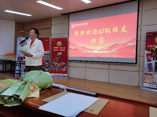 学科建设、人才培养和科学研究取得的成果。老校友们为学校南迁武汉后地球物理学科建设取得的丰硕成果倍感欣慰。学校图书档案与文博部长帅斌详细介绍了学校 1970年前后响应国家号召离开北京南迁办学的艰难经历。刘庆生代表65级同学会向学校赠送了聚会纪念徽章。大会在中国地质大学校歌“勘探队员之歌”的嘹亮歌声中结束。