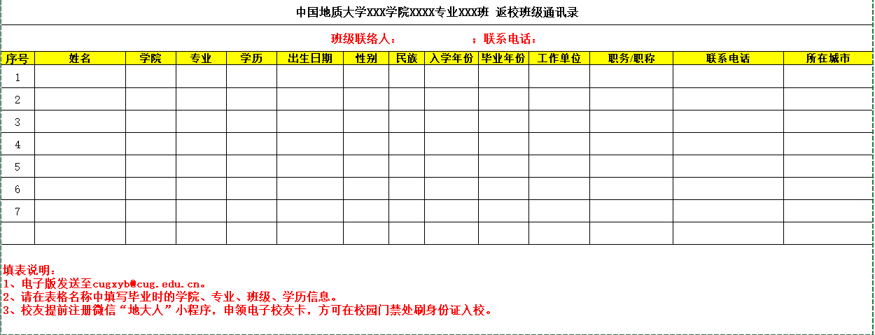 以班级为单位返校的校友,可填写《返校班级通讯录》,经学院确认后发至校友处邮箱[email protected],或联系校友服务办公室027-67883684,校友处会为每位返校校友准备爱校纪念包。