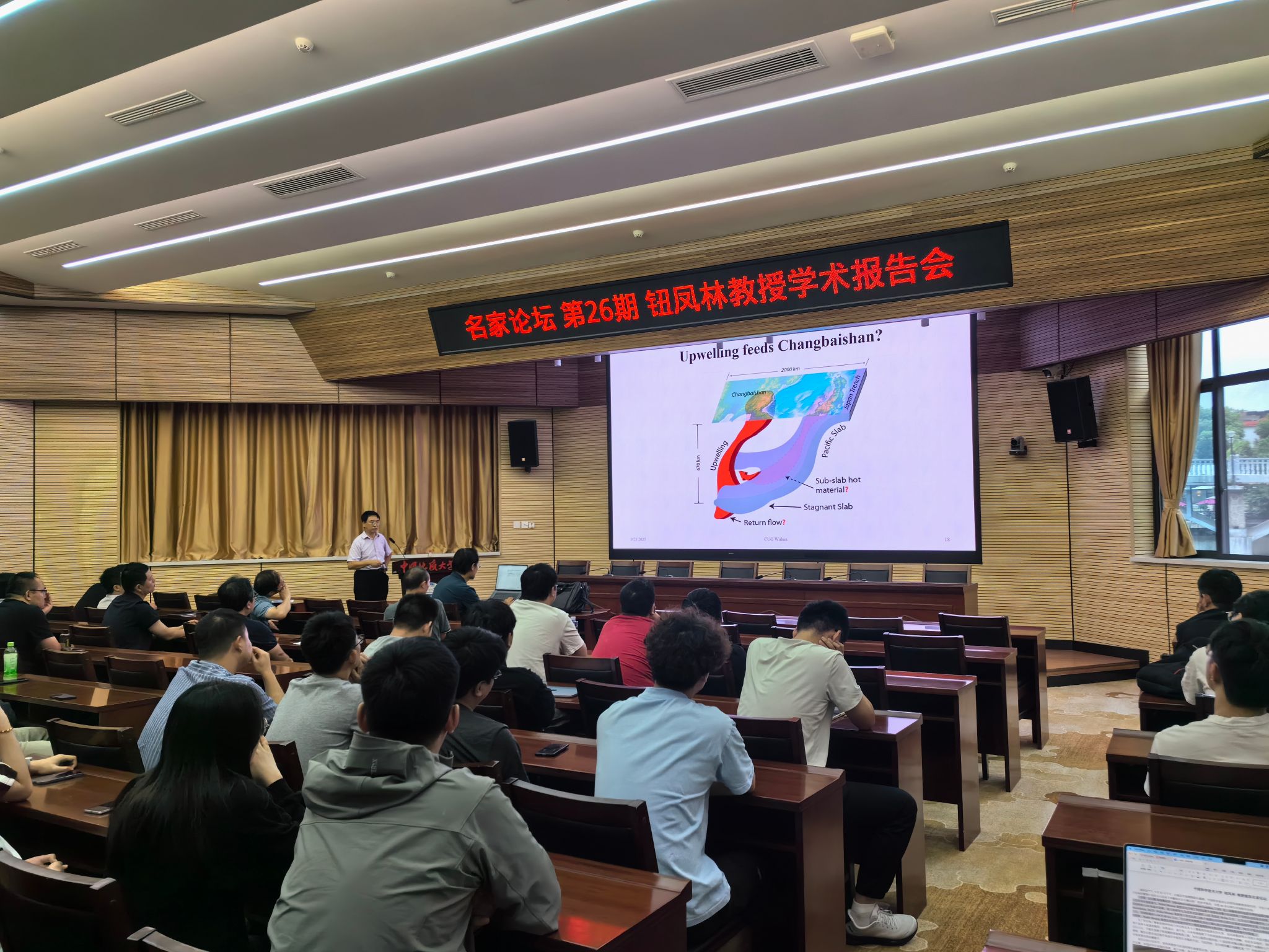 熊熊院长邀请,中国科学技术大学钮凤林教授来校访问,并在八角楼学术报告厅做了“东亚波形层析成像:东北亚下方由板块撕裂引发的火山活动与西藏地区岩石圈沉陷”的学术报告,全校60多位师生到场聆听讲座。